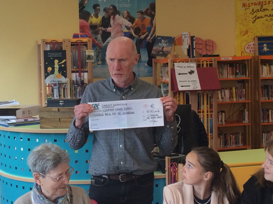 Un petit goûter de crêpes (excellentes, merci Bernard !) est venu clore ce moment attendu impatiemment des deux côté de la cour. Et, cerise sur les crêpes, c’est le moment que Monsieur Philippe, Principal du collège, a choisi pour remettre au nom de tous un chèque de 400 euros gagné lors des Trophées de la vie locale. Cette somme récompense les actions impliquant les rapprochements intergénérationnels. Elle a trouvé une première utilité dans l’achat des jeux mis à disposition du petit groupe.